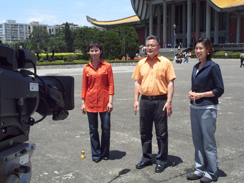 王世林和台湾主持人王德恺在台北地标孙中山纪念馆前进行节目录制(来源:央视网)