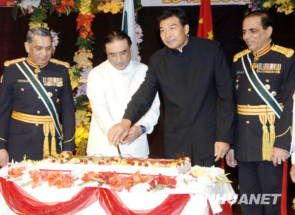 10月2日晚,在位于巴基斯坦首都伊斯兰堡的中国大使馆,巴总统扎尔达里(左二)与中国驻巴大使罗照辉共同切蛋糕庆祝新中国60华诞。当日,扎尔达里出席中国驻巴使馆举行的招待会。新华社记者李敬臣摄 |