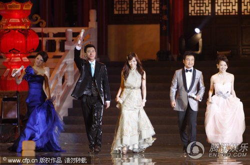 2009央视秋晚正式开场,五位主持人曾宝仪(香港)季小军(cctv)侯佩岑(台湾)鲁健(cctv)梦桐(cctv)林栋甫一同出场。