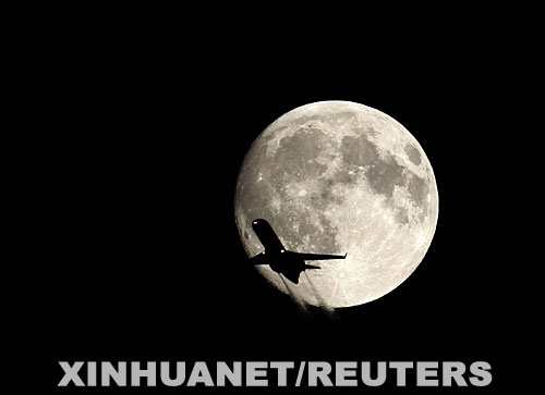 9月25日,在匈牙利首都布达佩斯,一架飞机从挂着满月的空中飞过。 新华社/路透