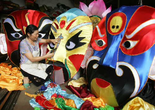 8月31日,苏州一名手工艺人对一组“脸谱”彩灯进行修饰。