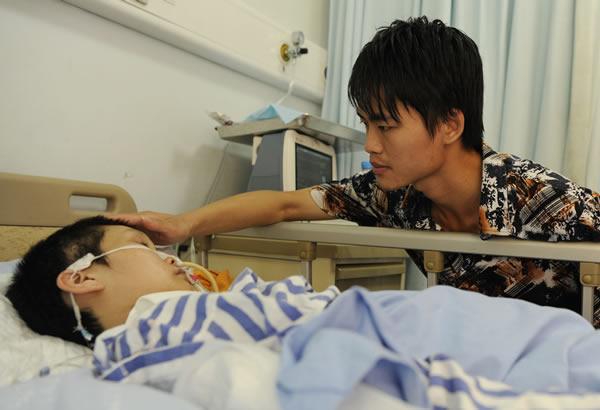 刘冬琴的丈夫范杨智一脸憔悴,他轻抚着妻子的额头,安慰着她。面对突如其来的变故,这个27岁的贵州小伙不离不弃。连续高温闷热的天气,冬琴久卧病床,却未长一个褥疮,这离不开丈夫的细心照顾。