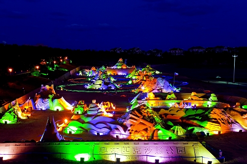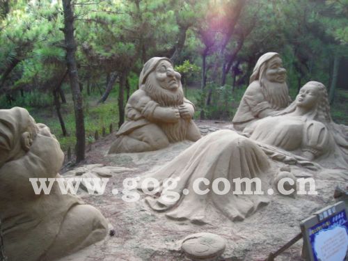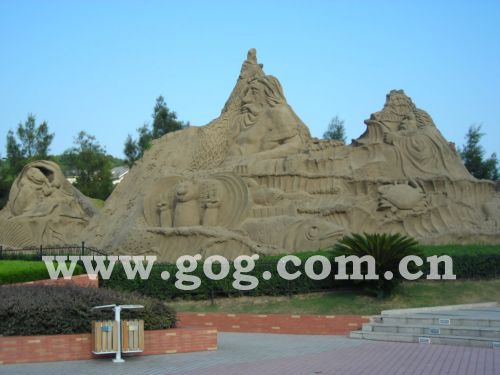 当天下午,“辉煌60年 全国网媒记者浙江行”采访团来到位于舟山朱家尖海滩公园,参观了该海滩公园。当记者们来到公园门前时,就被一副巨大的雕塑作品吸引了,走进一看才发现,原来这尊雕塑全部都是用沙子雕砌而成的。走进公园后发现,公园内通往海滨公园的道路两旁,都是用海砂雕塑的作品:有小孩子喜欢的白雪公主和小矮人,有神秘莫测的埃及金字塔,还有英姿飒爽的运动健儿......总之,只要想得到的,这里都应有尽有,这便是被喻为将沙子变成金的沙雕艺术。