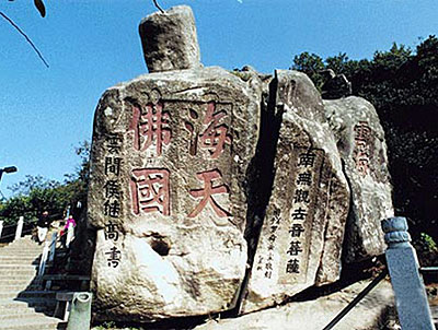 ■海天佛国石 海天佛国石位于香云路尽头处,路侧有一石大如屋,斜置若扑,上镌"海天佛国"大字,今已成为普陀山之代称。岩顶累一石,长方形,如同一面风帆,镌"云扶石",崖间尚有"云海"、"别有一天"题刻,为普陀山摩崖石刻较为集中处。