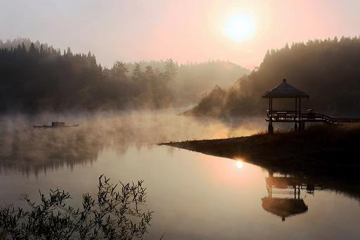 云消雾散,湖水奇妙的颜色渐渐显露。不是绿,不是蓝,又似绿似蓝。恰似白居易《忆江南》中“春来江水绿如蓝”。