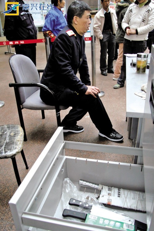 嘉兴火车站安检升级,管制刀具以外的菜刀等利器钝器也不得随身携带,一律放在行李中托运。实习生 朱卫国 摄
