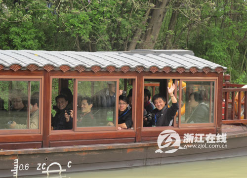 来自山城重庆的华龙网新闻部副主任高霞很陶醉坐在船头,享受清风拂面,看着柳絮纷飞的感觉,她说:“你们南方的景色很细腻,很有感觉,区别于西部的那种粗犷。可惜呆的时间太短。”