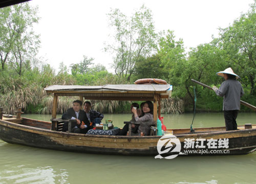 21日上午,参加“诗画江南——全国知名网络媒体浙江行”的数十名网记们第一站就来到了西溪湿地,寻找电影里的镜头。