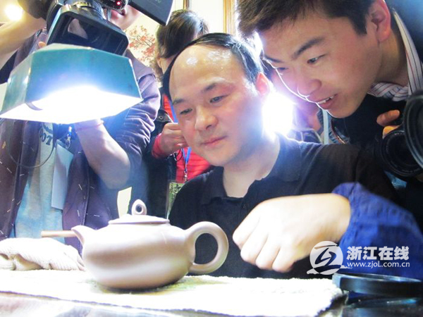 在工作室里,摆放着各式各样的紫砂壶,精湛的工艺,细腻的花纹,都让人啧啧称赞。“这不是茶具,简直就是一件件精美的工艺品”,人民网的李璐颖捧着紫砂壶爱不释手。