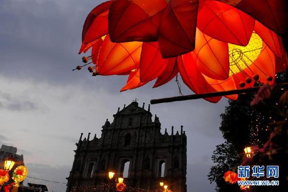 这是澳门大三巴牌坊前的灯饰(9月9日摄)。近日,澳门特区民政总署在澳门各知名旅游景点装上富有中国特色的节日灯饰,营造了浓郁的中秋节气氛。(新华社记者 张金加 摄)