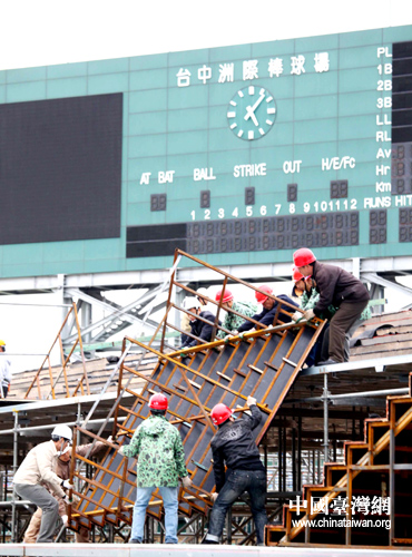 《图兰朵》在台中洲际棒球场的搭台工作正在紧张进行。(中国台湾网 李徽 摄)