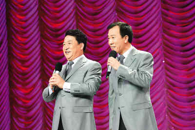 图为姜昆(左)和戴志诚在表演新作《我有点晕》。