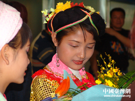 中华海峡两岸原住民暨少数民族交流协会理事长,即台湾少数民族代表团团长华加志和夫人走在了最前面,刚一出机场通道就受到了国家民委、云南政府和省民委领导的热烈的欢迎,云南的少数民族姑娘们亲手为华先生及夫人戴上了象征“吉祥如意”的香包,献上了鲜花和祝福。图为美丽的云南姑娘。(于小亮)
