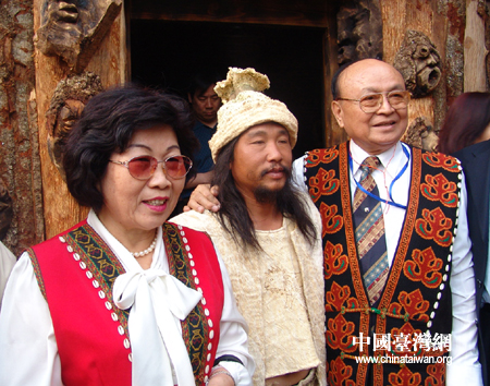 开幕式后参加第三届海峡两岸少数民族发展研讨会的台湾代表团代表参观云南民族村。图为华先生夫妇与哈尼族穿树皮衣的族人合影。(于晓亮)