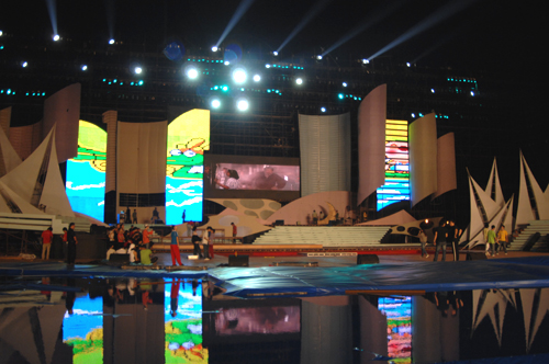 央视秋晚是近年来 “中华情”在日常歌会之外承办的重要主题晚会。从2004年在上海浦江畔举办的“浦江月·中华情”到2005年在武汉黄鹤楼脚下举办的“江城月·中华情”,一直在户外举办的秋晚日益形成了自己的艺术风格。景观舞美便是这众多艺术风格中最闪亮、最夺目的一点,也是2005年“江城月·中华情”获得国际大奖的重要原因。不知大家是否还记得2004年浦江畔那艘蓄势待发的帆船,以及2005年黄鹤楼脚下再现的琼楼玉宇,秋晚的舞台成为中华民族地缘文化符号的艺术再现,给全球华人留下了深刻印象。