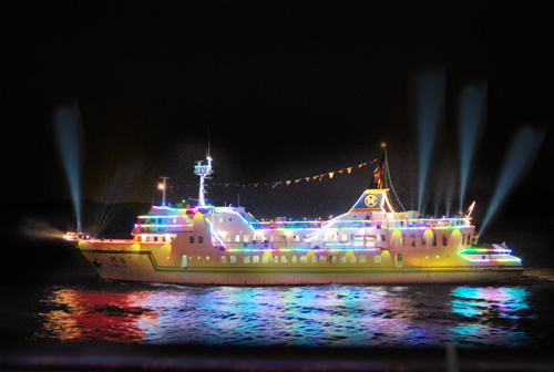 在厦门主会场上的独立主持平台和观众席两侧,以“团圆兔”中秋吉祥图案以及海鸥、彩云、风帆、航船和鱼所组成的大型灯饰带连绵不绝,形成中秋之夜海上大型灯会的景观效果。
