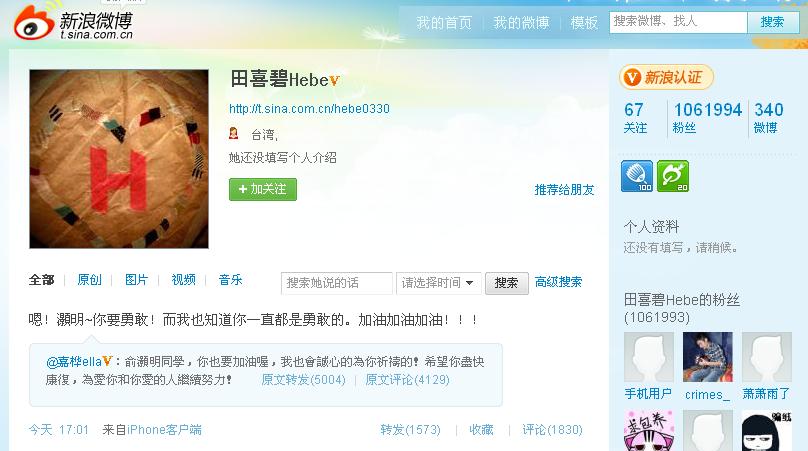 Hebe在下午五点左右更新,并转发Ella的文字,鼓励俞灏明要勇敢面对,以下是其微博文字:
