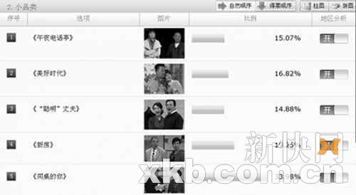 本次春晚相声类参选的不多,结果也相对有较大差距。春晚的老面孔冯巩、牛莉的《还钱》以46.72%处于第一,而第二名是《芝麻开门》以24.46%紧随其后,支持率为22.37%的姜昆、李伟健等笑星的相声《专家指导》居于第三,而首次参加春晚的何云伟、李菁的《独家录制》以6.45%处在末尾的位置。