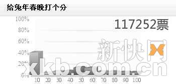 在某娱乐门户网站“给兔年春晚打个分”这一投票中,仅仅只给最低分10分的观众竟然达到39.8%之多,次级较多的投票集中在50分和60分,50分占13.1%,60分占12.1%,不满意的声音为绝大多数,不过仍有4.4%,共计5111位网友表示可以给到100分,虽然在总数里少得可怜,但也不失为一份意见。