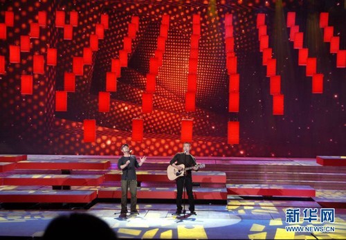 1月31日晚,在中央电视台春节联欢晚会彩排现场,“旭日阳刚”组合表演歌曲《春天里》。冯威锋 摄 图片来源:新华网