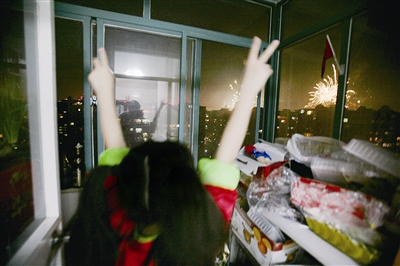 零点,鞭炮声响起,烟花在窗外绽开,妙可一蹦三尺高,跑到阳台上去观景儿。阳台上温度比较低,她边跳着脚,边张着双臂高喊着:“爸爸,快看那朵,哇噻,真好看!”