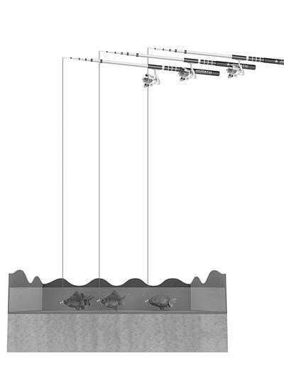 魔术师的助手在天花板上用鱼线勾着鱼饵诱鱼。