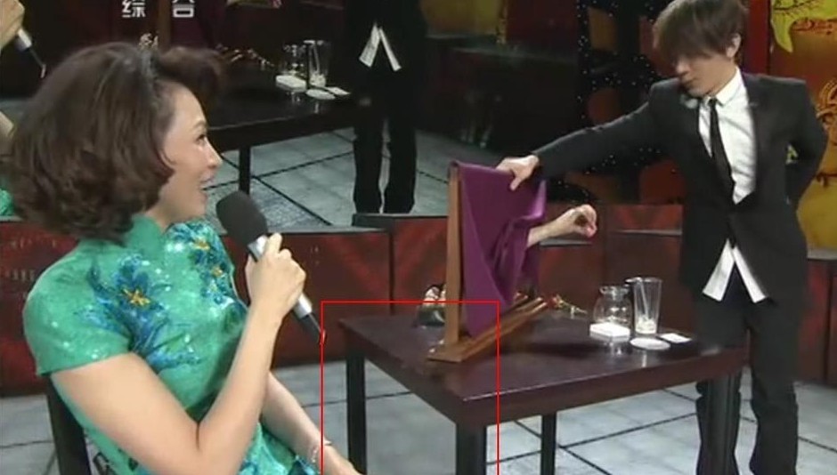 网友揭秘刘谦春晚魔术。桌子下面有个镜子,就是说实际上只有一半位置是空间,另一半是个三角形的箱子,里面藏了人。注意看刘谦开始做的那个位置桌子下面的颜色,很不自然。