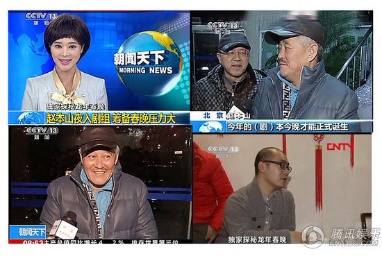 腾讯娱乐 2012年1月13日讯,央视探班春晚准备现场。赵本山13日凌晨加入春晚剧组,在采访中赵本山表示剧本需要在当晚才能正式诞生。谈及现在的心情,赵本山表示压力很大,自己正靠吃药调理身体,并称还没确定带哪个徒弟上场。