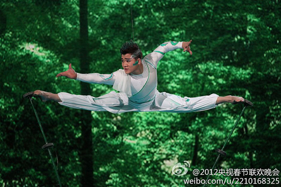 富有诗意的名字《空山竹语》却是暗藏玄机。这是一个高难度的杂技节目。主舞台彩幕和立体景观营造的竹海,与身着白色长衫的杂技演员摇摆的“翠竹”随风飞舞,一切轻灵飘逸。