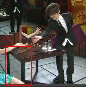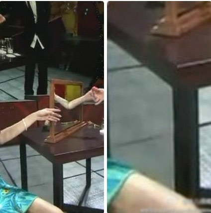 ohdarlin:这很简单。桌子下面其实有个镜子,就是说实际上只有一半位置是空间,另一半是个三角形的箱子,里面藏了人。你们注意看刘谦一开始做的那个位置桌子下面的颜色怪怪的。