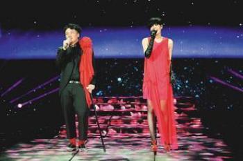 王菲(右)、陈奕迅演唱《因为爱情》,备受关注。(图片来源于:台湾《联合报》)