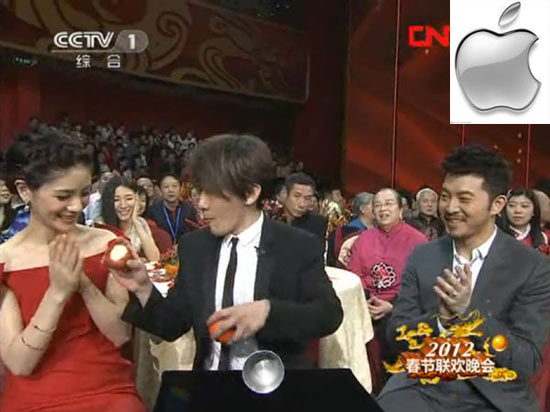 在刘谦开始表演魔术时,他先对身边的胡可和沙溢夫妇变出了球,再向后一抛变出一个苹果。他咬了苹果一口后,将苹果递给了身边的胡可。有网友惊呼:“这不是那个著名的电脑商标吗?……”