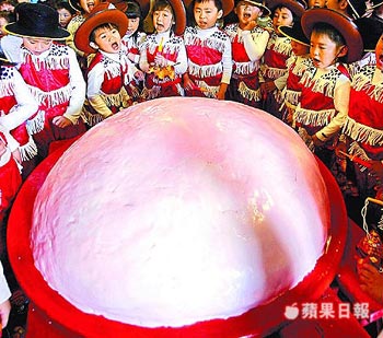 万斤米糕桃。南投县松柏岭受天宫制作重1万台斤、号称全台最大的元宵超级米糕桃,昨举行开香揭桃仪式。庙方表示,因玄天上帝脚踩龟、蛇,为了对龟神表示敬意,才将米糕龟改为米糕桃 。来源:台湾《苹果日报》