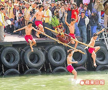 跳海求降福。台北县野柳神明净港文化祭昨天上午8时许登场,今年共有8顶神轿参与净港,在加油声浪中,壮丁们扛着神轿跃入冰冷海水,上岸后再进行过火,祈求神明降福,现场热闹非凡。来源:台湾《苹果日报》