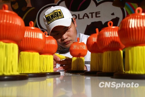 2月23日,在位于北京鸟巢旁的巧克力梦公园内,制作大师正在用巧克力制作灯笼,以此迎接即将到来的元宵佳节。据了解,在元宵节期间,将有来自护国寺小吃的厨师在现场教民众做巧克力元宵,还会有传统的猜灯谜等活动。中新社发 富田 摄
