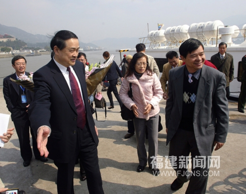 2月24日,马祖新任县长杨绥生一行15人经“两马”航线抵达福州马尾,参加当晚亮灯的“第八届两马同春闹元霄”活动。这是他2009年12月5日当选马祖县长后首次到福州。(张丽君 摄)