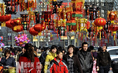 2月6日,市民在呼和浩特中山路商业街上赏灯购物。 元宵节即将来临,呼和浩特市的主要街道上悬挂起各种彩灯,让市民感受到了浓浓的节日气氛。 新华社记者 李欣摄