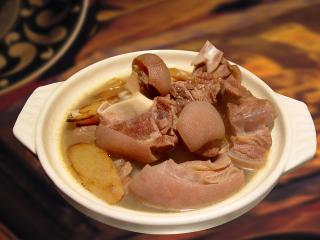 敢吃羊肉的人不妨试试烧酒羊,这乃是主厨将肉质细致的澳洲羊肋排切块洗净,用沸水川烫过后,与中药材-生姜、当归、枸杞、川芎,水与米酒一比一的比例一起放入锅中,先以大火滚开后改为炆火炖煮约3小时。