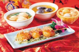除此之外,蟹肉、山药,还有热门的寒天,都成了元宵的新主角。六福客栈的“橙汁萝卜丝汤元宵”,将柳橙汁加入外皮,炒过的白萝卜丝、虾米与香菇当内馅,配上香菇鸡汤;另一款“寒天三色汤圆”,则把人气旺的寒天、抹茶作汤底,加入混合了紫山药、红萝卜及橙汁作成的三色汤圆。