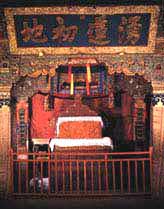 红宫是达赖的灵塔殿及各类佛堂。共有灵塔8座,其中五世达赖的是第一座,也是最大的一座。据记载仅镶包这一灵塔所用的黄金就达11.9万两之多,并且经过处理的达赖遗体就保存在塔体内。西大殿是五世达赖灵塔殿的享堂,它是红宫内最大的宫殿。殿内除干隆御赐“涌莲初地”匾额外,还保存有康熙皇帝所赐大型锦绣幔帐一对,为布达拉宫内的稀世珍品。传说康熙皇帝为了织造这对幔,曾专门建造了工场,并费工一年才得以织成。从西大殿上楼经画廊就到了曲结竹普(即松赞干布修法洞),这座公元七世纪的建筑是布达拉宫内最古老的建筑之一,里面保存有松赞干布、文成公主及其大臣的塑像。红宫内的最高宫殿名叫萨松朗杰(意为胜三界),其中供奉清干隆皇帝画像和“万岁”牌位。大约自七世达赖格桑嘉措起,各世达赖每年藏历正月初三凌晨都要来此向皇帝牌位朝拜,以此表明他们对皇帝的臣属关系。
