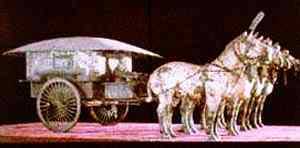 陵墓地宫中心是安放秦始皇棺椁的地方,陵墓四周有陪葬坑和墓葬400多个,范围广及56.25平方公里。主要赔葬坑有铜车、马坑、珍禽异兽坑、马厩坑以及兵马俑坑等,历年来已有5万多件重要历史文物出土。1980年发掘出土的一组两乘大型的彩绘铜车马--高车和安车,是迄今中国发现的体形最大、装饰最华丽,结构和系驾最逼真、最完整的古代铜车马,被誉为“青铜之冠”。