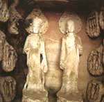 宝顶山摩崖(石窟)石刻距大足县城东北15千米,石刻创始人为宋蜀中名僧赵智凤,建于南宋淳熙六年至淳祐九年(1179—1249年),历时70多年,石刻共13处,造像数以万计,以大佛湾和小佛湾规模最大。宝顶山是佛教圣地之一,有“上朝峨嵋,下朝宝顶”之说。