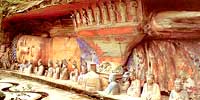 大足石刻位于四川省重庆市,以大足县、潼南县、铜梁县、壁山县为范围,在此地可赏到代表中国唐、宋时期的石刻造像艺术。大足石刻是大足县境内主要表现为摩崖造像的石窟艺术的总称。大足石刻群有石刻造像70多处,总计10万多躯,其中以宝顶山和北山摩崖石刻最为著名,其以佛教造像为主,儒、道教造像并陈,是中国晚期石窟造像艺术的典范,规模之宏大,艺术之精湛,内容之丰富,可与敦煌莫高窟、云冈石窟、龙门石窟齐名。