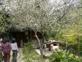 南庄乡田美村2邻22之3号兰亭咖啡民宿占地9公顷,除了庭园、木屋,屋后是偌大的桃、李果园,主人许金桂当初开垦时,保留了原有的果树,融入庭园景观,元旦后梅花盛开,一树白华,风过处片片白雪飘落,美景醉人。