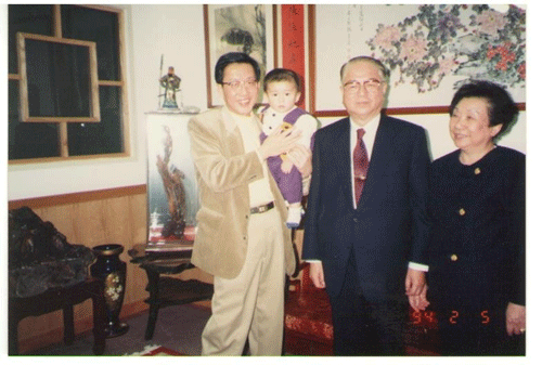 (图片说明:1994年12月摄于林洋港先生台北寓所。图中左一为我的丈夫陈毓钧抱着我们的儿子,中为前国民党副主席、台湾前“司法院”长林洋港先生,右一为林洋港先生夫人。)