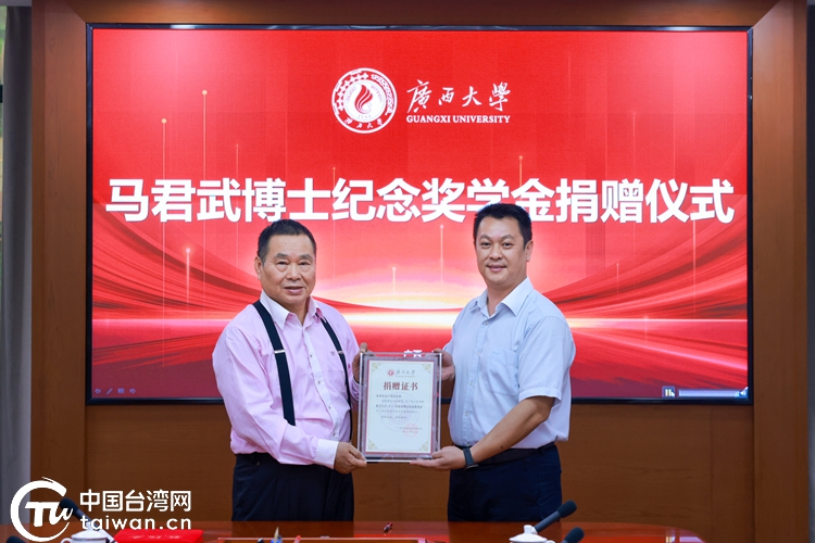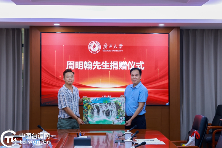 仪式现场,彭桂港与周海斌签署新一轮“马君武博士纪念奖学金”捐赠协议,并进行现场捐赠与证书回赠。台北广西同乡会台湾青年周明翰捐赠了山水画作,寓意两岸山水相依、情谊长存。(中国台湾网、广西台办、广西大学联合报道)