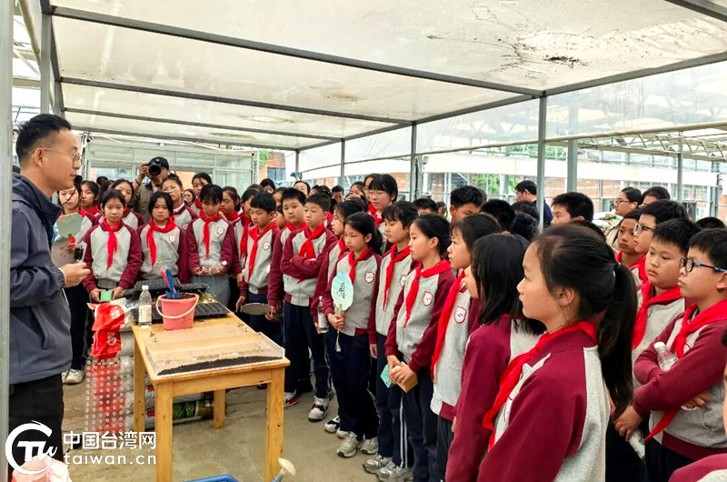学生代表在聆听讲解员介绍农作物栽培技术。(中国台湾网发)