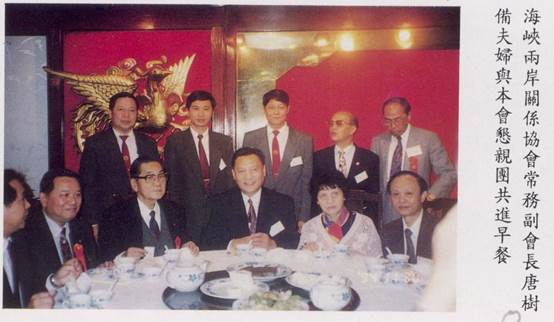 1994年,原国台办副主任唐树备(前排右三)及市委台办、市台联领导会见台北市中山同乡会乡亲。