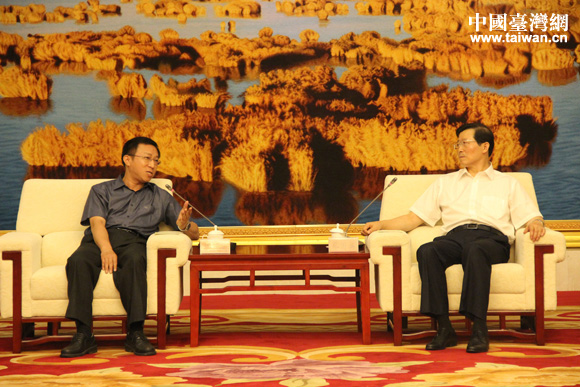 宁夏自治区党委宣传部部长蔡国英(右)会见了以国台办新闻局局长杨毅为团长的两岸记者采访团一行。(中国台湾网 王文英 摄)