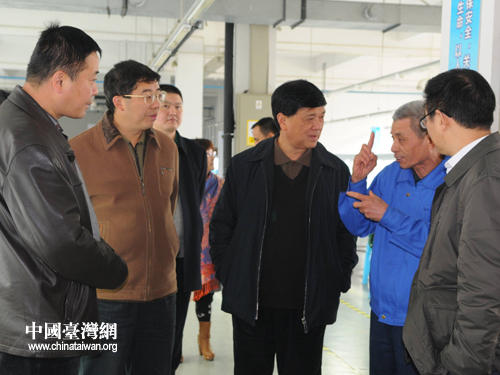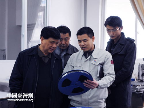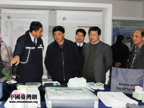 刘俊杰一行参观什邡大爱感恩环保科技有限公司环保产品。(图片来源:四川省台办)